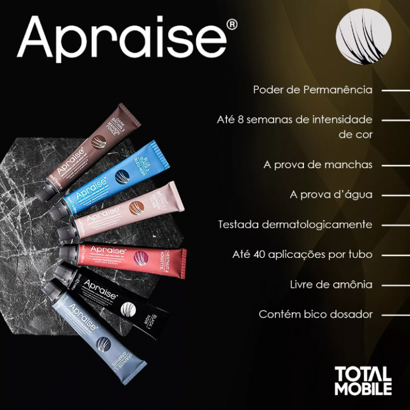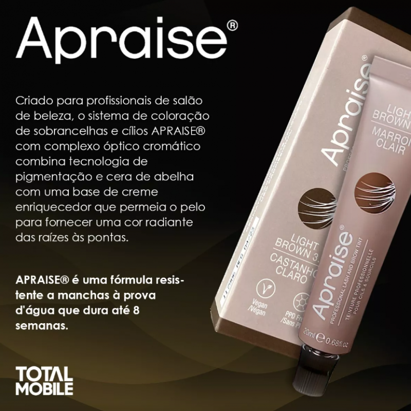 Apraise é uma tintura específica para sobrancelhas, cílios, barba e bigode. As tinturas Apraise permitem criar um volume das raízes às pontas e suas sobrancelhas e cílios ficam mais destacadas e o melhor, de forma natural. É ideal para mulheres e homens que já estão com seus pelinhos brancos, ou para quem está com os pelinhos claros demais. A tinta é livre de amônia e completamente profissional e impermeável (à prova d'água). Nutre e trata enquanto colore, realça fios claros e brancos. Sua consistência homogênea ajuda a manter a tonalidade do pêlo e não tinge a pele. Diferente da Henna, Apraise é utilizada para colorir o fio.