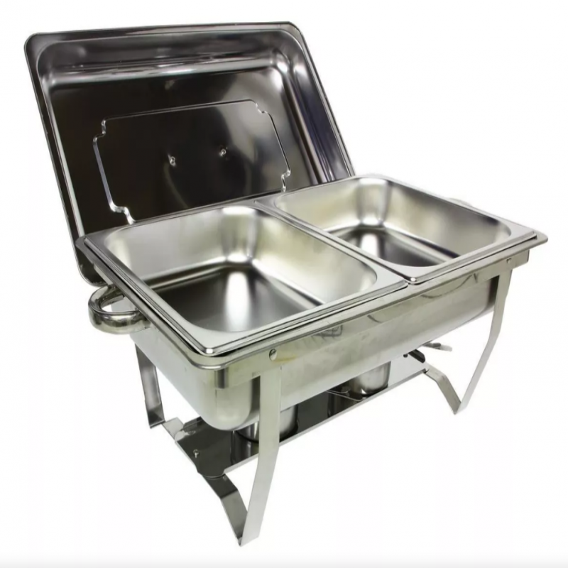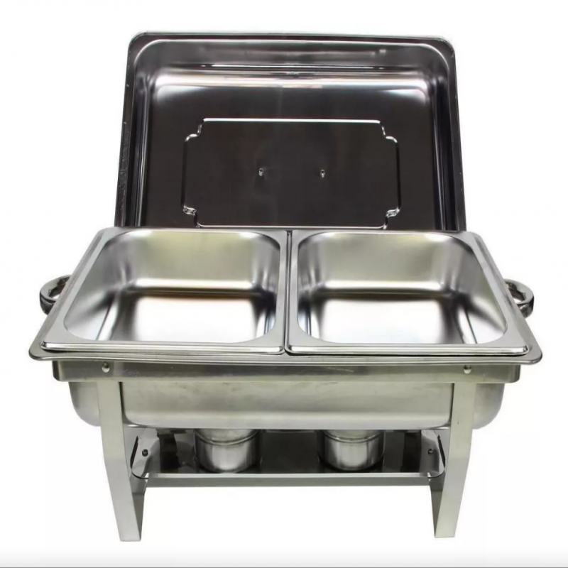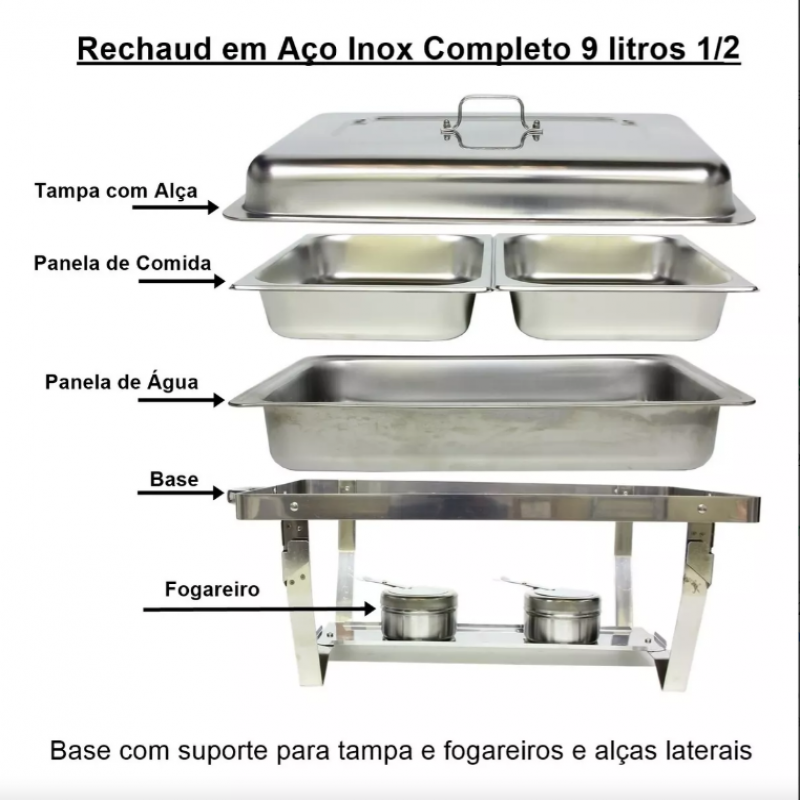 Contém 3 cubas removíveis, 2 para os alimentos e 1 outra para a água, que mantém os alimentos aquecidos pelo calor do(s) fogareiro(s) Utiliza cubas de tamanho global (GN), podendo ser utilizadas em outros Rechauds ou Buffets Sistema de reciclagem hidrológica (a água condensada na tampa retorna para a cuba d'água automaticamente) Cubas com cantos arredondados e paredes lisas que facilitam a limpeza.