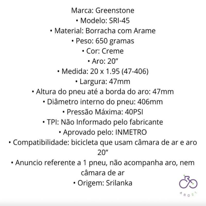 Pneu de bike BMX aro 20' x 1.95 Greenstone SRI-45 Creme 47-406