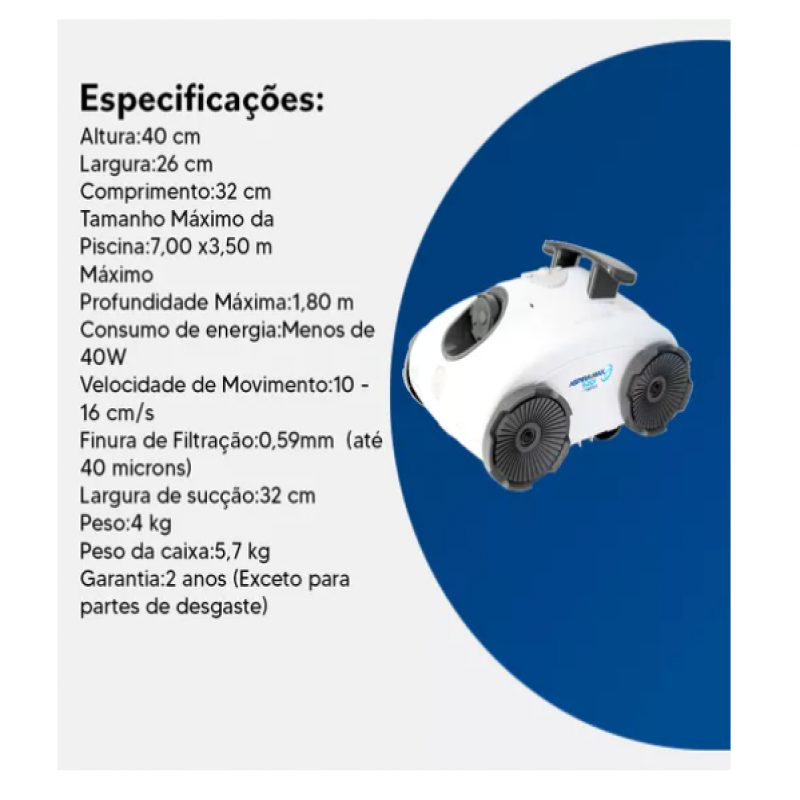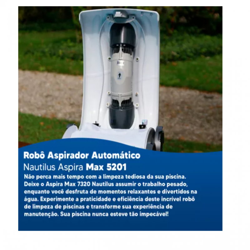 Aspira Max 5201 Nautilusni tozalash Robot basseyningizni osongina va iqtisodiy jihatdan toza saqlash uchun juda mos keladi. Har qanday filtrlash tizimiga mos kelganda, u hovuzlarda 7.00 x 3,5 metrgacha foydalanish mumkin. Uning fokusli oqim texnologiyasi chuqur va samarali tozalashni ta'minlaydi, bu savatni toza va osonlikcha tozalangan aralashmalar. Robot iqtisodiy, kam operatsion narxga ega va mos keladigan yo'nalish va tezlikni sozlash bilan ta'minlanadi. Engil (4 kg), ishlov berish va saqlash oson, Aspira Max 5201 NAUTLAUT ANDUTIUS Boolni oddiy va samarali vazifani tozalash.